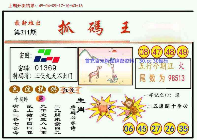 | 312期:一点红--精品24码--开:龙14准 02.05.06.07.10.11.12.13.14.16.19.20 24.25.26.29.30.35.38.40.44.45.46.49 |